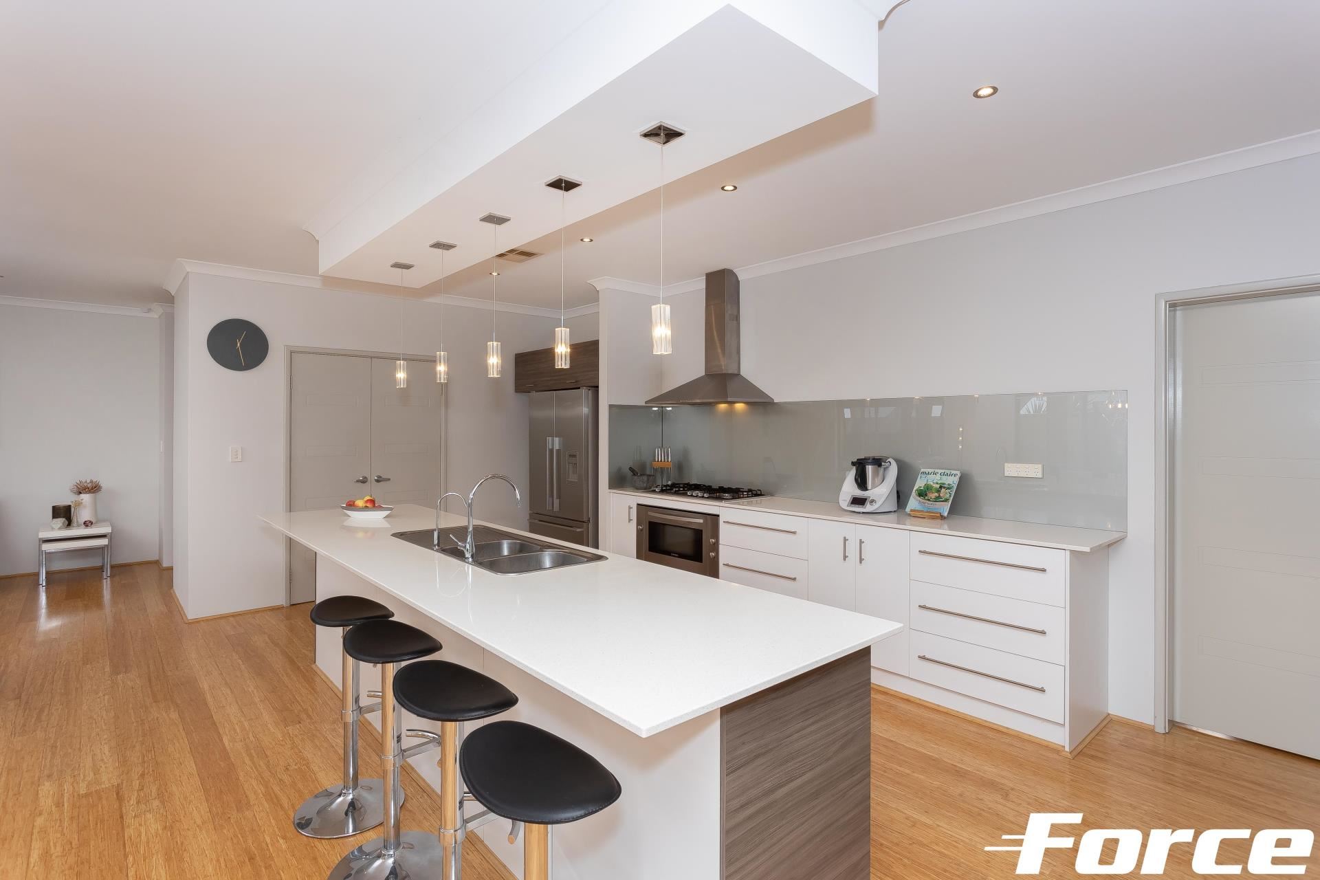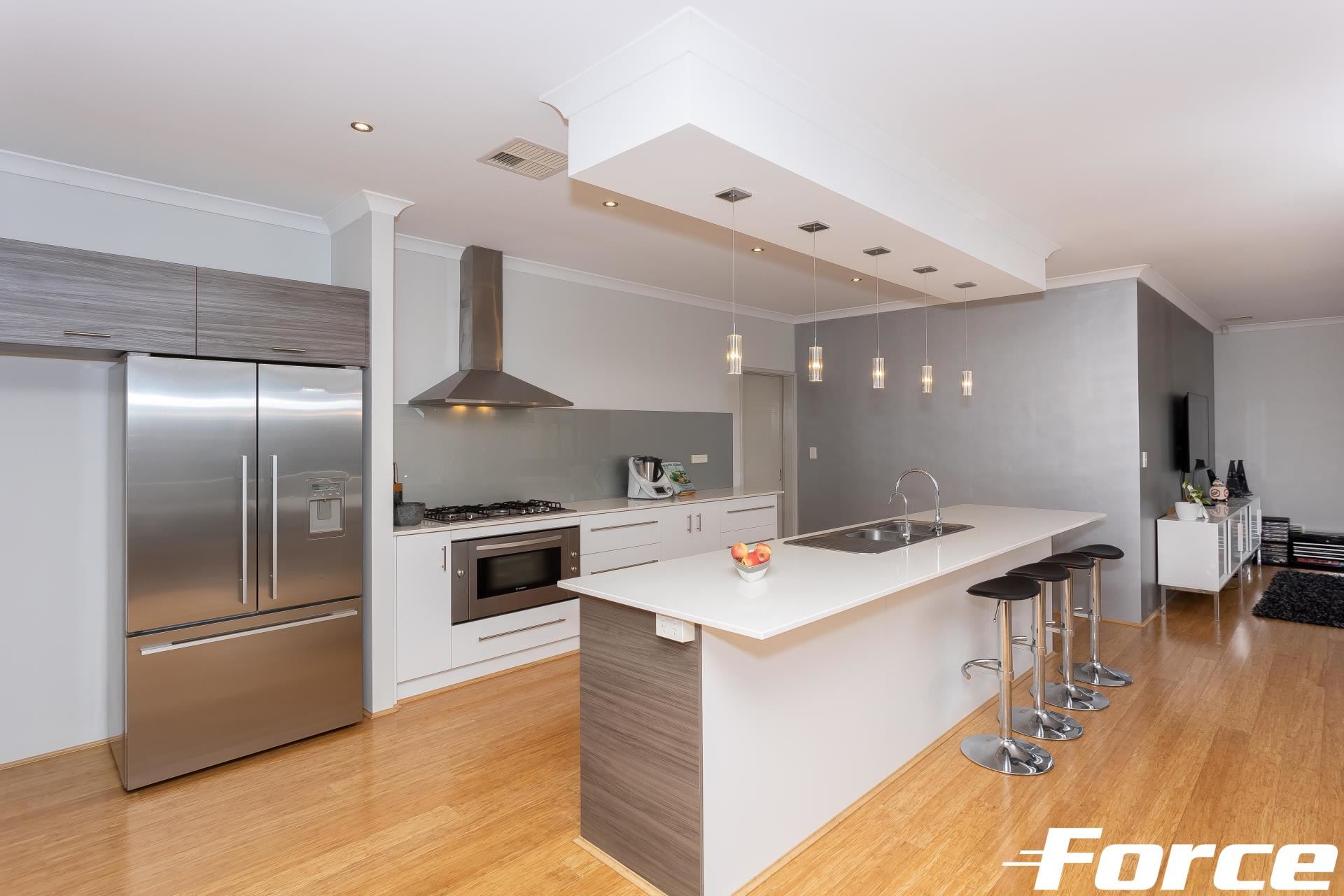 – Deluxe kitchen with double fridge recess, dishwasher, great bench space and stone tops